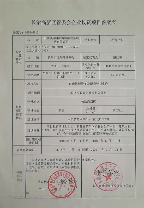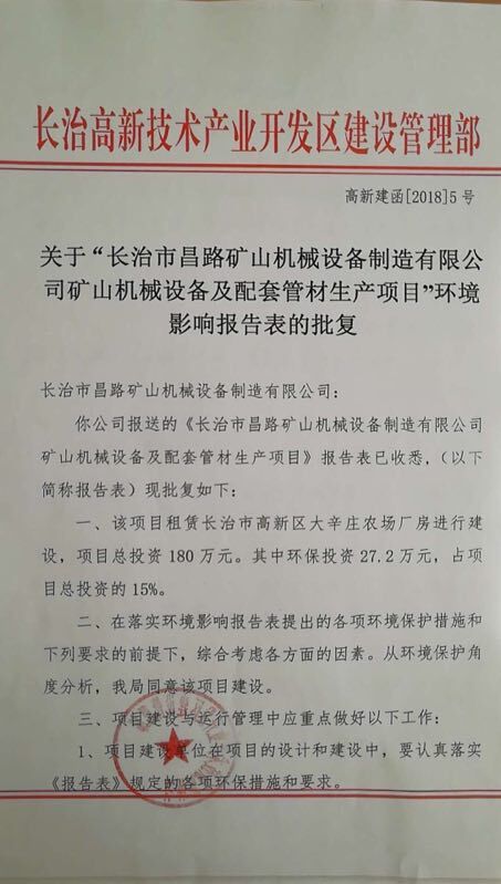 關(guān)于“長(zhǎng)治市昌路礦山機(jī)械設(shè)備制造有限公司礦山機(jī)械設(shè)備及配套管材生產(chǎn)項(xiàng)目”環(huán)境影響報(bào)告表的批復(fù)